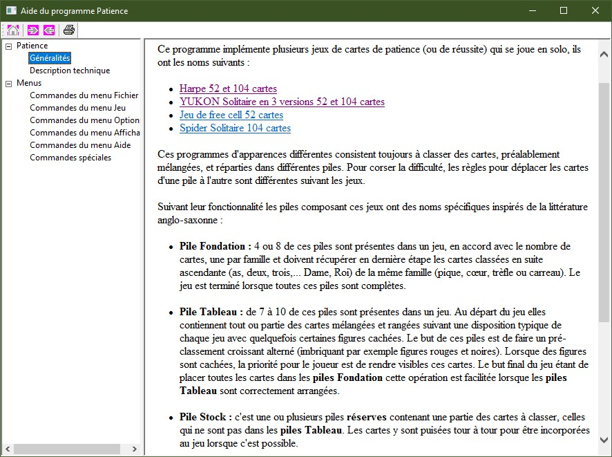 - Descripteur des jeux : Les fichiers CardsDesk.cpp et CardsDesk.h, contiennent la description des 7 jeux actuels du programme. Pour chacun un texte ASCII décrit la composition du jeu, le nombre de cartes utilisées, la disposition des piles et les règles d'usage. Les dimensions s'adaptent à la taille des cartes affichées. Les commentaires présents dans ces fichiers indiquent comment créer un nouveau jeu et pour les règles d'accès il faut se reporter aux fonctions CPile::RdCardsTest() et CPile::WrCardsTest() qui définissent les règles pour la capture et la déposition d'un paquet de cartes avec la souris dans les fonctions Drag/Drop.