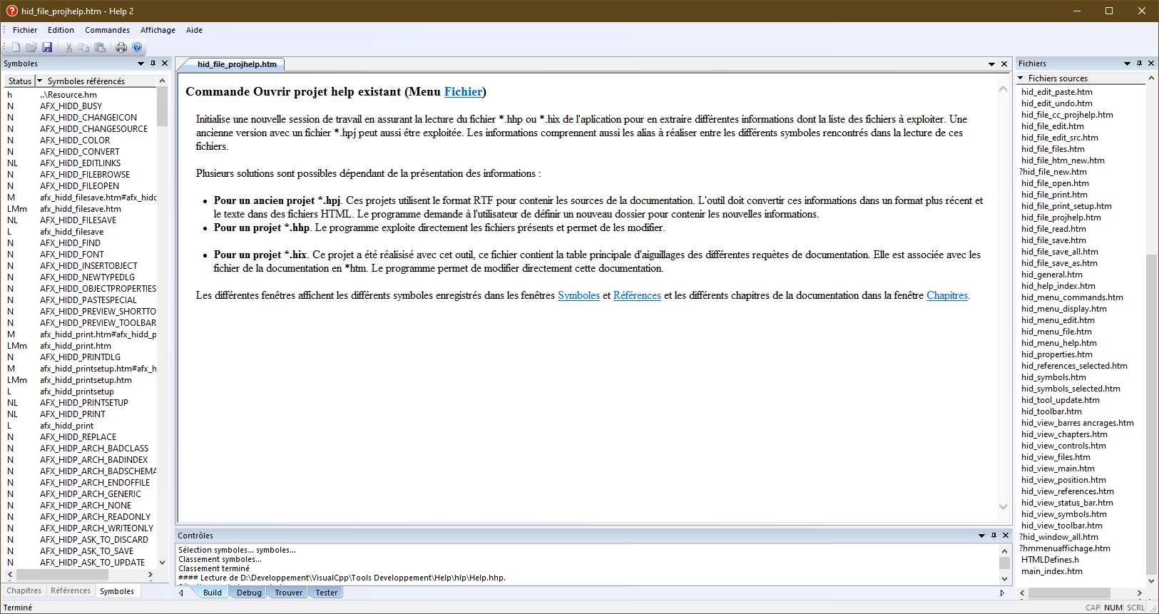 • La deuxième assure l’analyse syntaxique des différents formats de fichiers en isolant les mots clés utilisés. Ce qui permet par exemple la conversion des fichiers RTF en HTML ou le décodage des différents fichiers de l’application : *.hhp, *.hhc, *.hhk, *.h ou pour les anciennes versions *.hpj, *.cnt, *.hm. Il est même possible d’extraire les informations de la description des menus contenus dans un fichier de ressource *.rc.